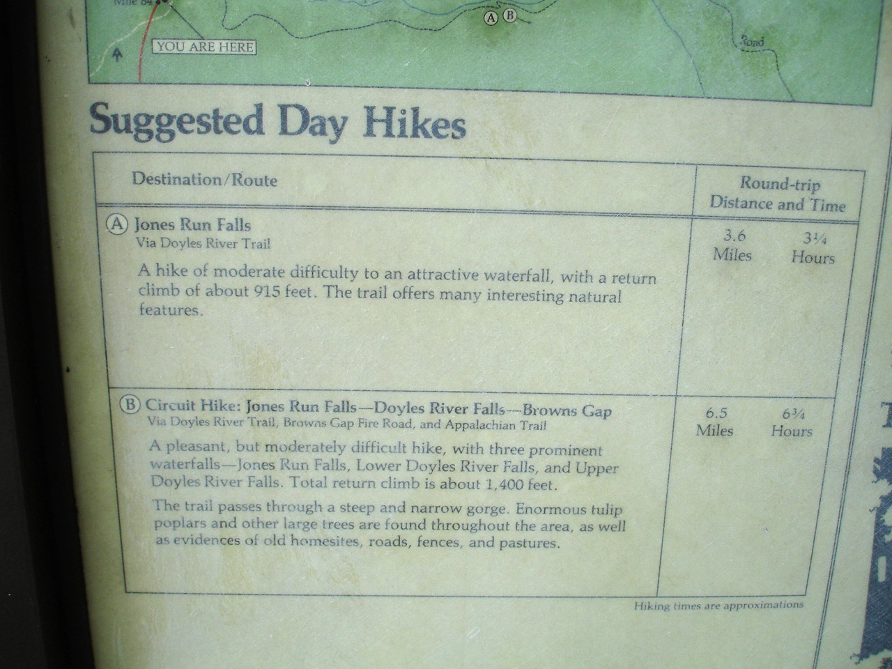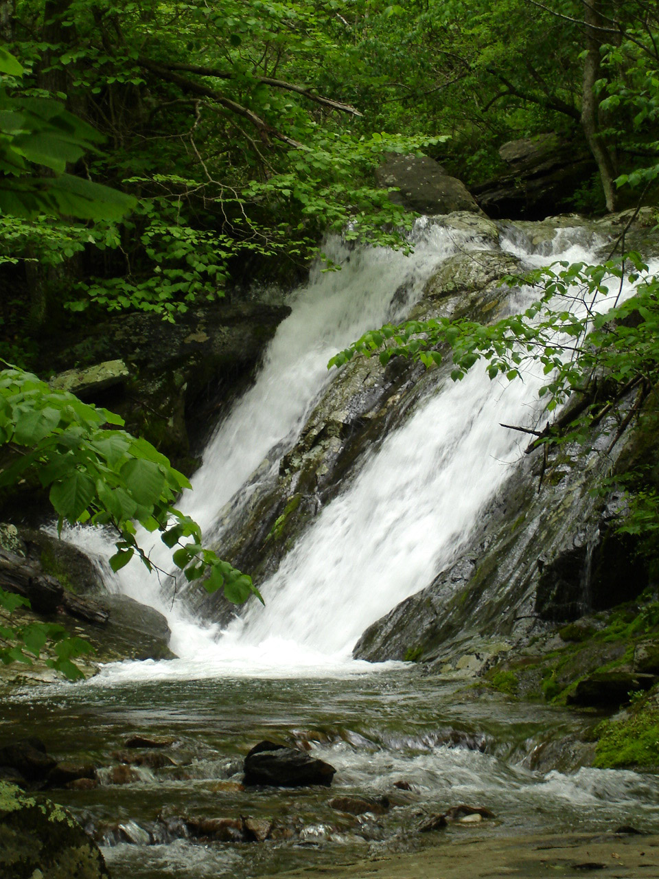 The description of the trail on the website is as follows: Jones Run Falls is at mile 84.1 in the South District of the park. Do you want a waterfall that will soothe your spirit and bring you peace? Try this one. The hike is 3.4 miles roundtrip, with a climb of 915 feet (Moderate). But the climb is gradual, so you may find it easier. The waterfall is a jewel—a cascade of 42 feet, surrounded by rocks, moss, and bushes. While sitting on flat rocks right in front of it, you become part of the scene!